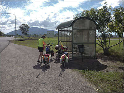 With limited shade close to the road, today would be a day of rest stops in bus shelters. We had lunch in the stop at the Woodstock – Giru Road intersection.