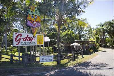 We didn’t hurry to get away this morning even though we had a 90km ride ahead of us. We eventually left Clairview at 9.45am. The road towards Sarina was very good most of the way and there was not much traffic. Twenty kilometres from Clairview we came across signs for an ice cream shop at Flaggy Rock. This meant a rest stop of course. As well as homemade natural ice cream, the shop sells coffee, cakes and light meals. Hans and Janice Plessing who own and run the business are very interesting people to talk to and we ended up staying there for more than an hour.