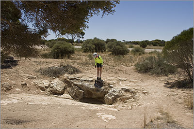 Caiguna Blowhole. The Nullarbor has many limestone caves and this cave entrance is less than 100m from the highway. If the cave entrance had been any closer we suspect the 90 Mile Straight would have been the 87.6 Mile Straight. It is known as a blowhole as you can sometimes feel the 'cave breathing' when the air moves into or out of the cave.